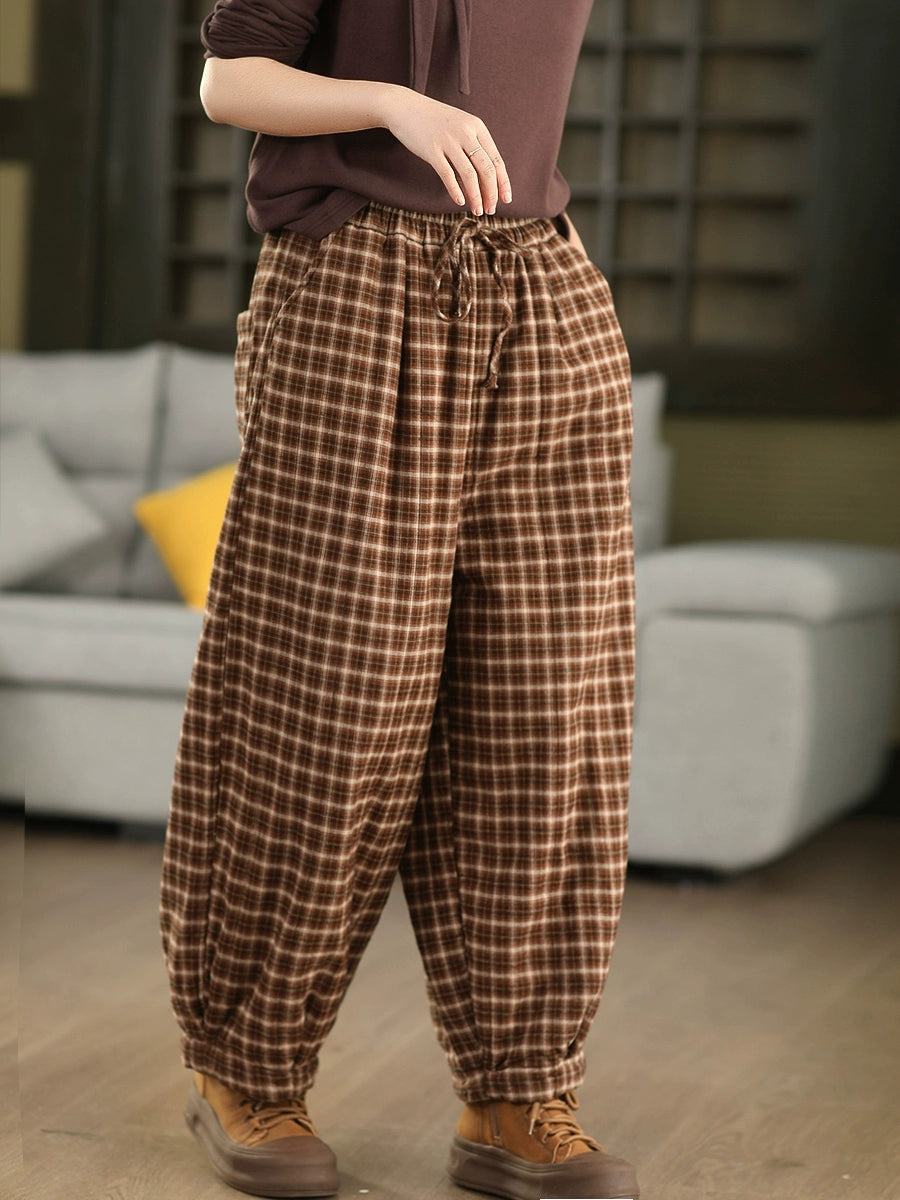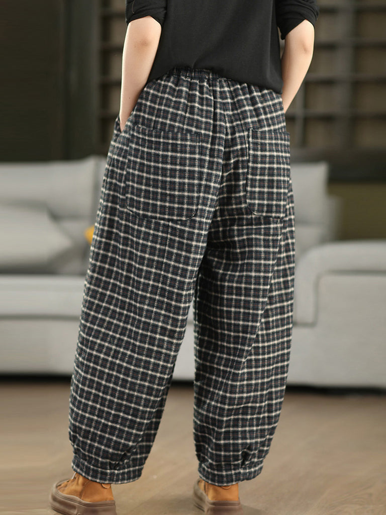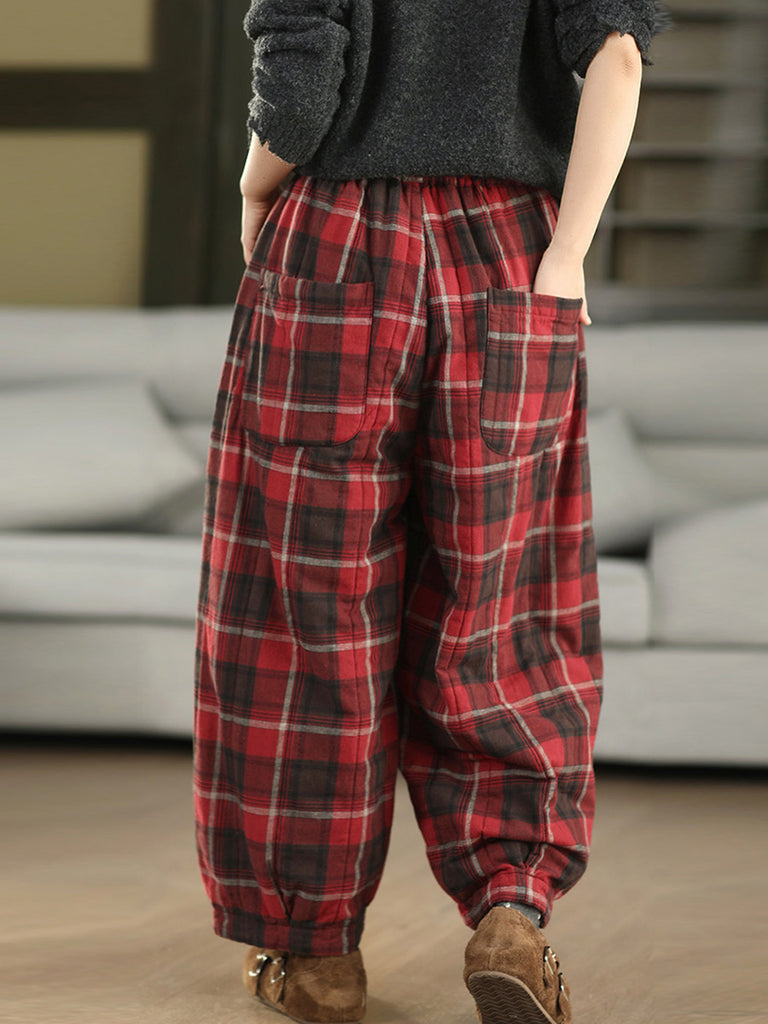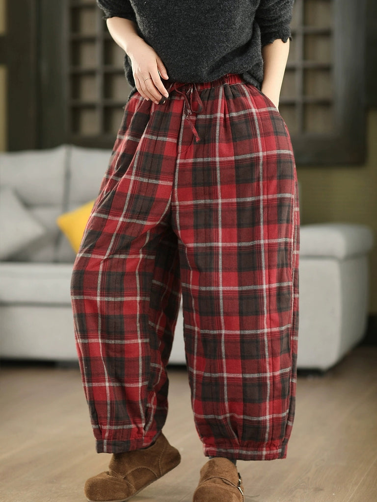 レディース 冬 レトロ チェック柄 100%コットン パッド入り ハーレムパンツ