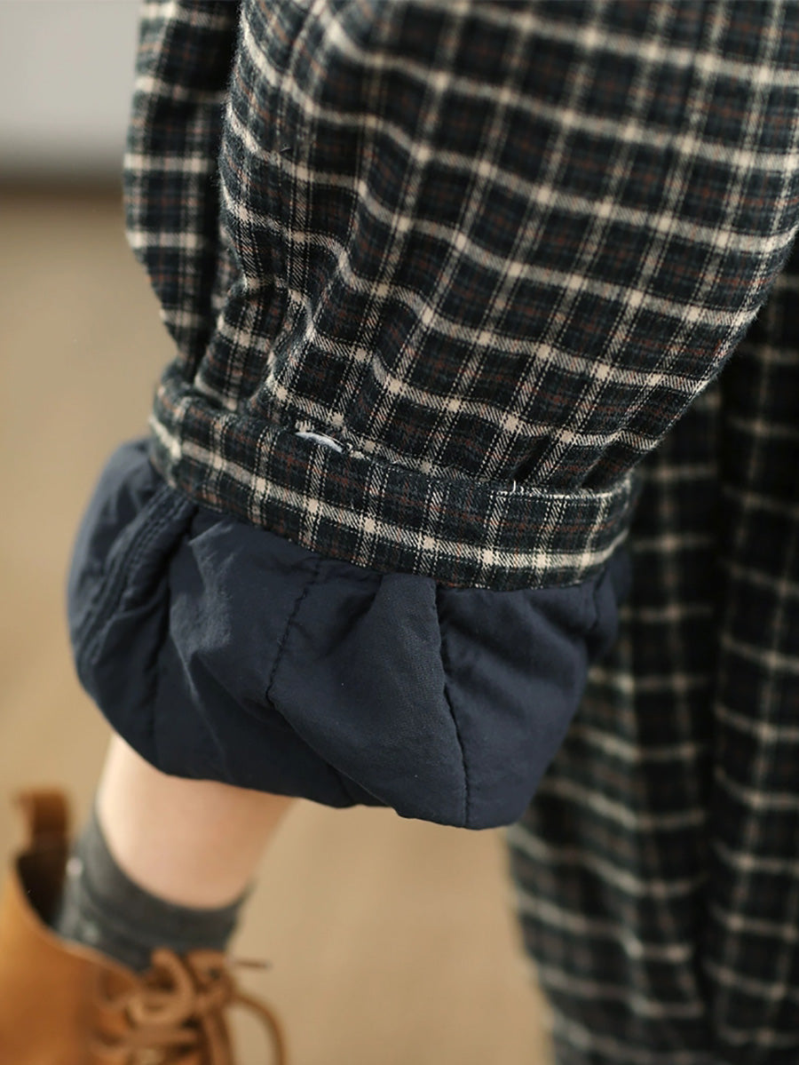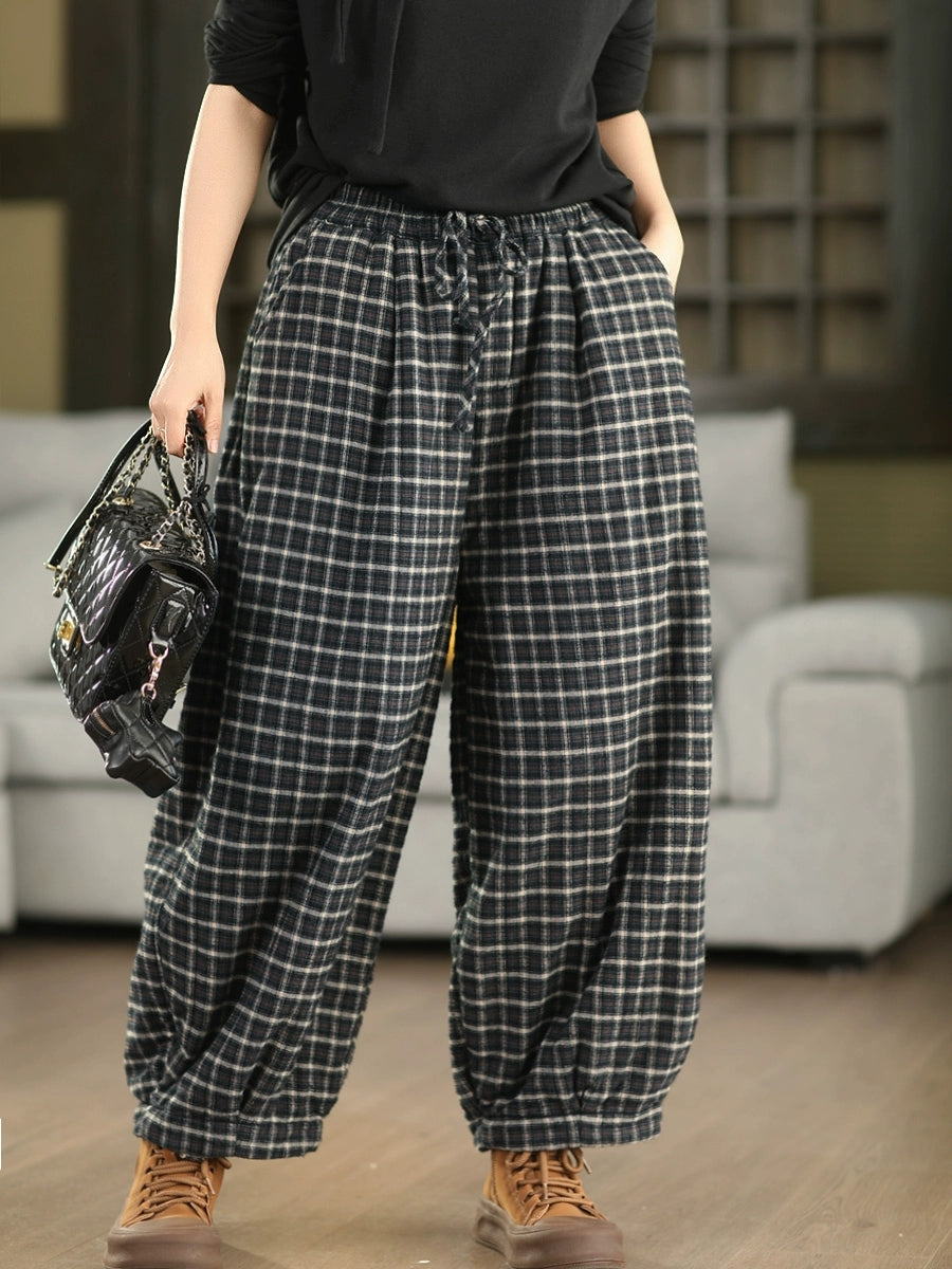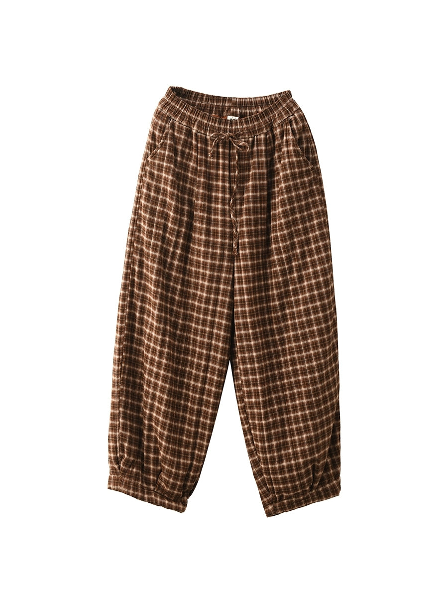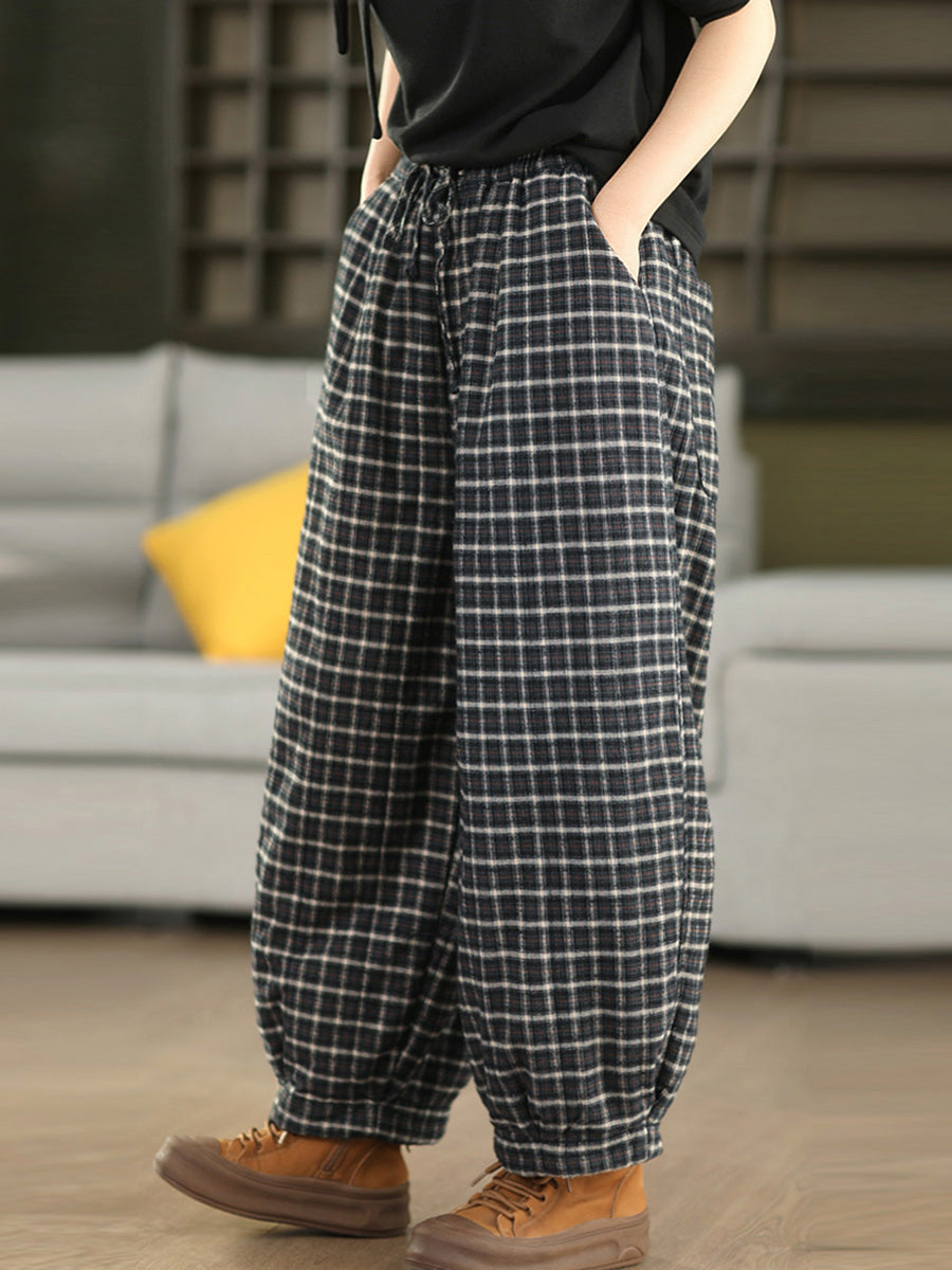 レディース 冬 レトロ チェック柄 100%コットン パッド入り ハーレムパンツ