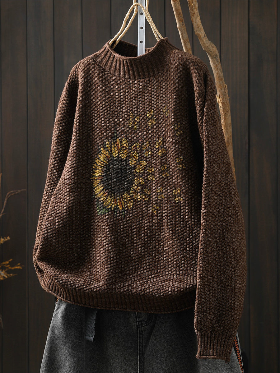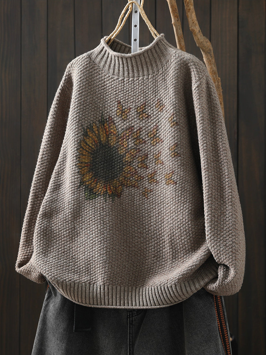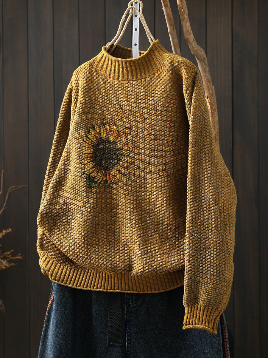 レディース 冬用 ひまわり柄 ニット ハーフタートルネック セーター