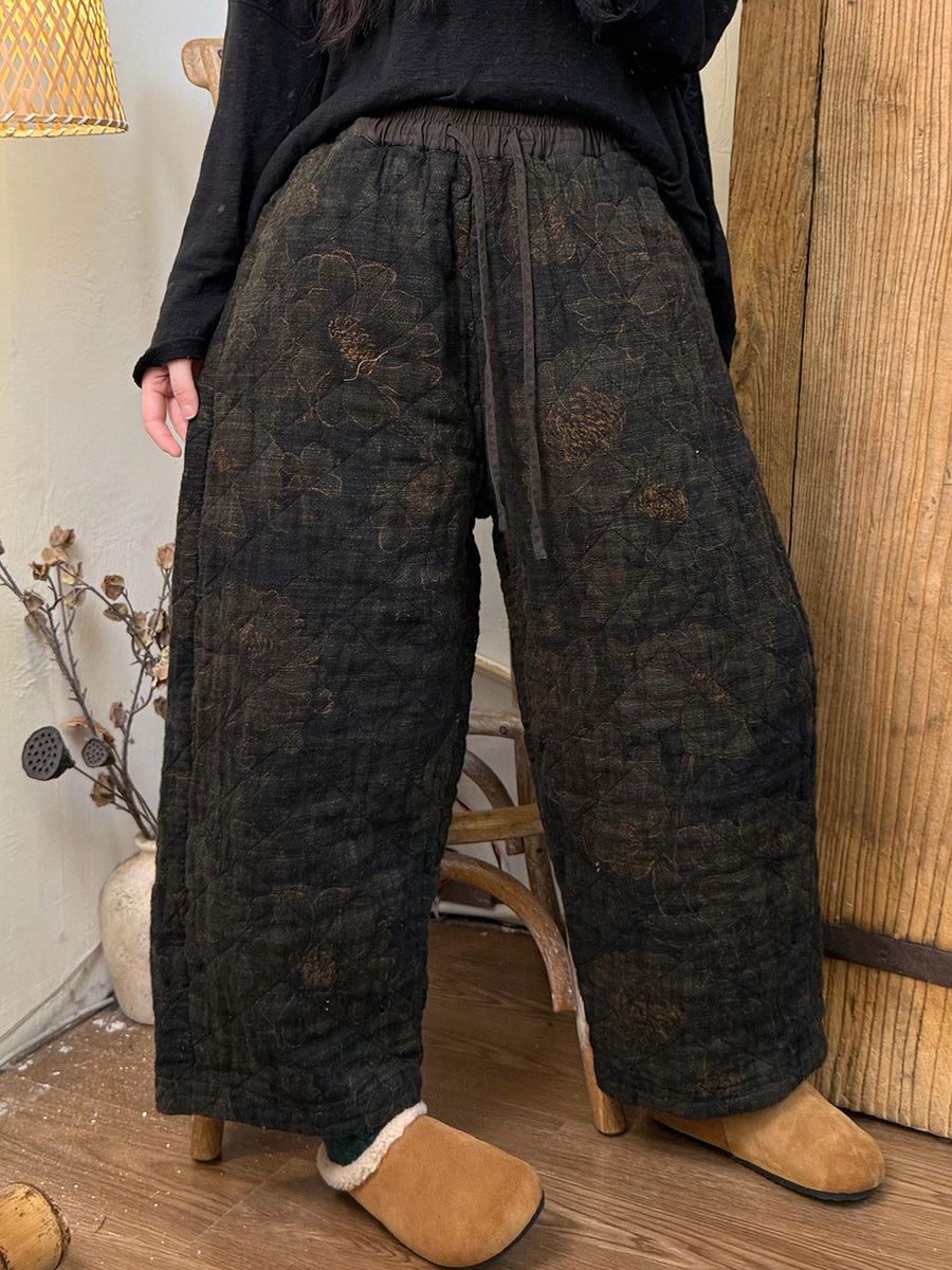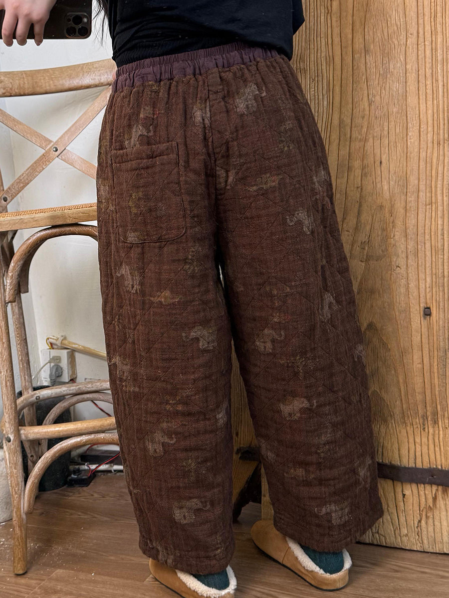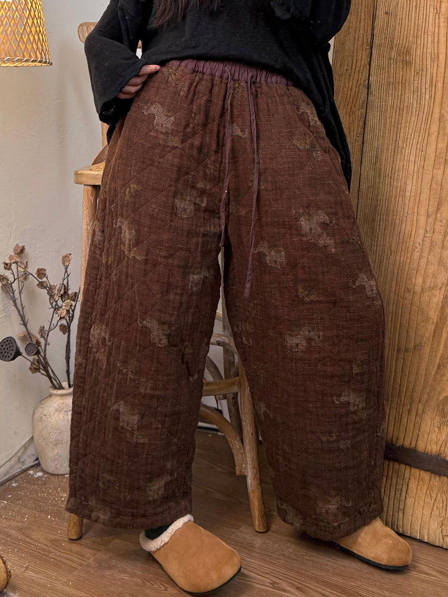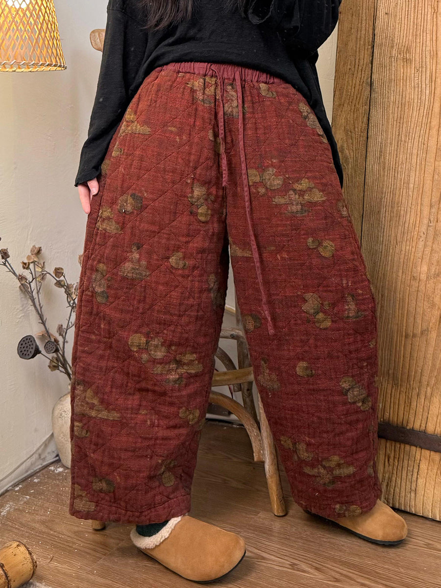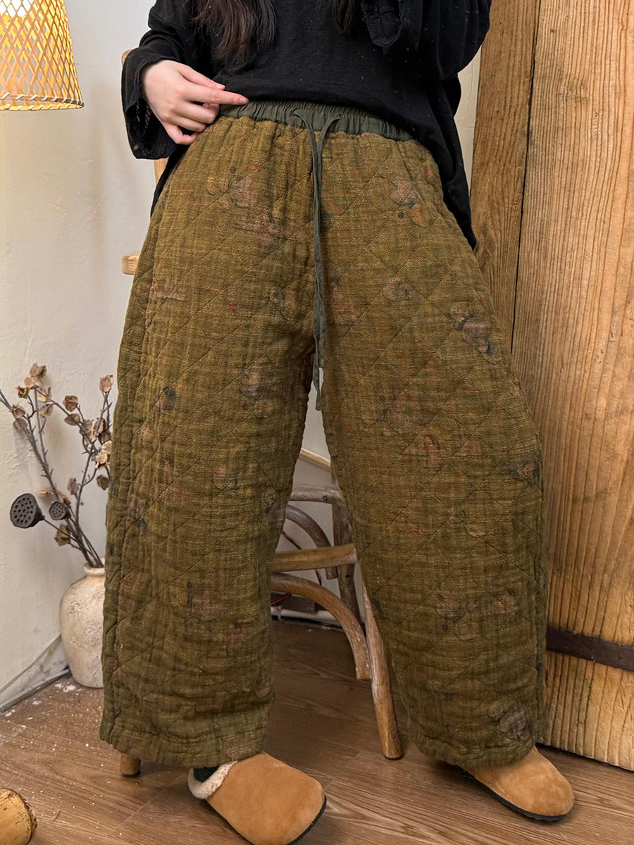 レディース 冬 ヴィンテージプリント リネン パッド入り ストレートパンツ